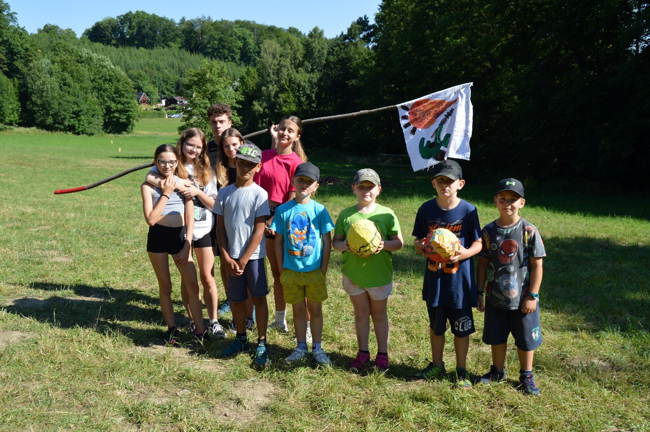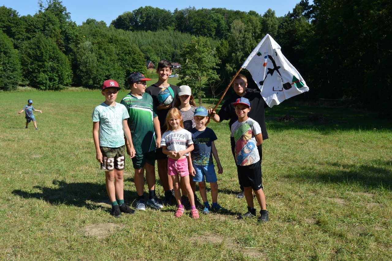 Ráno po snídani jsme vyrazili připravit si naší louku na další zábavné aktivity, postavili jsme taborák a pro sportovní zápolení hřiště na fotbal, ringo a vybíjenou. K obědu jsme se posilnili ovocnými knedlíky a vyrazili vyzdobit naše dračí sluje a v soutěži poměřit ručně vyrobené luky. Později před věčeří jsme naše postavená hřiště hned vyzkoušeli a den zakončili prvním z nácviků na Dračí talentovou soutěž. Do peřin jsme zalezli poctivě a s chutí, jelikož nás zítra čeká putování za pokladem Zlatého draka.